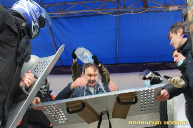 Це трапилося під час масових радикальних акцій протесту у Луцьку 19 лютого. На сцені Євромайдану, куди протестувальники витягнули Олександра Башкаленка, йому влаштували «холодний душ», обливши мінеральною водою з п’ятилітрової пляшки. Вони пояснили свій вчинок тим, що Башкаленко повинен відчути те, що відчувають хлопці на Майдані в Києві, яких обливають водою з водометів навіть у мороз.