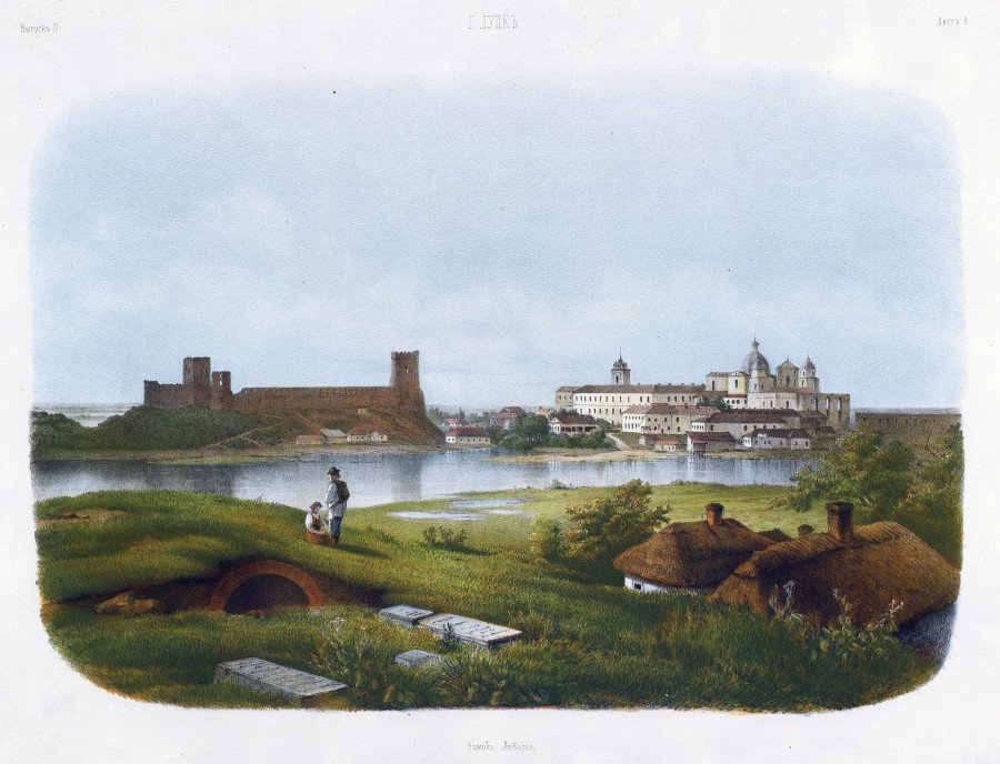 Їх помістили у відомий восьмитомник «памятники русской старины в западных губерниях», який видавався у 1868-1885 роках. Перші чотири томи 1868-1869 років присвячені Волині. У них містяться хромолітографії (кольорові малюнки, виготовлені спеціальним методом) з виглядами місцевостей та окремих пам’яток Володимира-Волинського, Луцька, Острога та Овруча. Крім того, в альбомах можна знайти карти цих міст часу формування книг. У волинській частині видання – 27 малюнків.Володимир-Волинський. Зображення з Державної публічної історичної бібліотеки Росії
