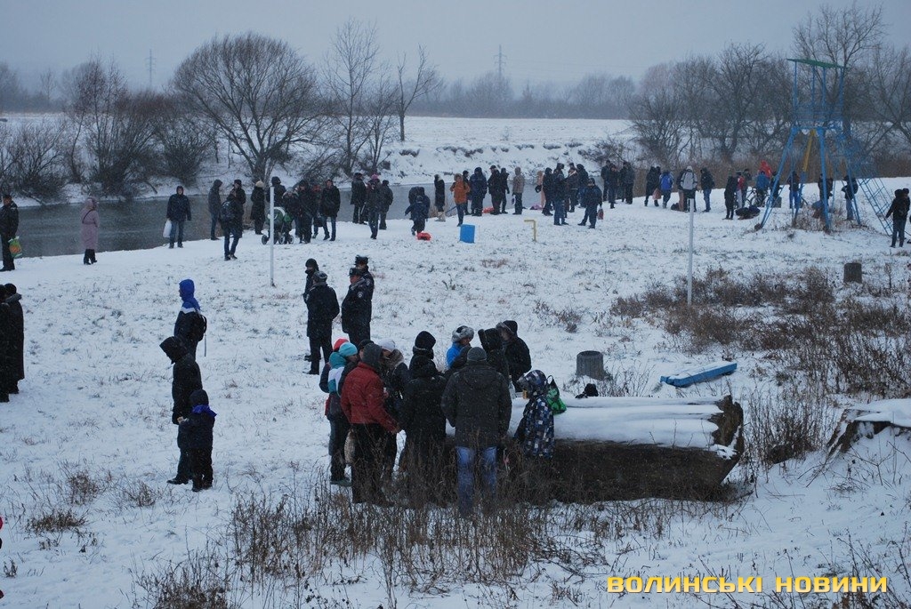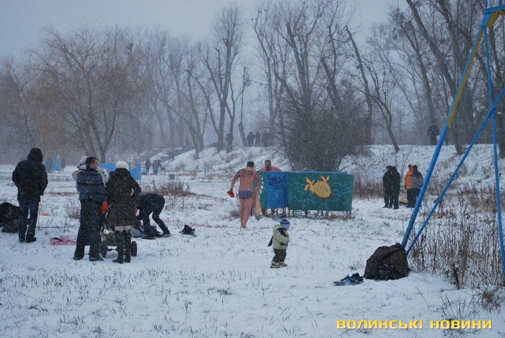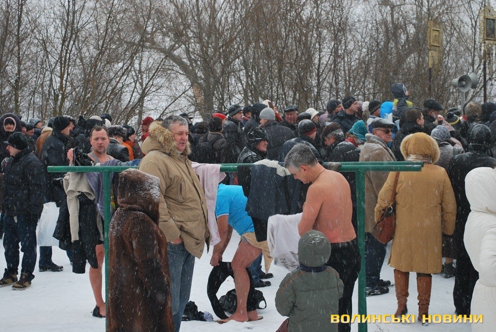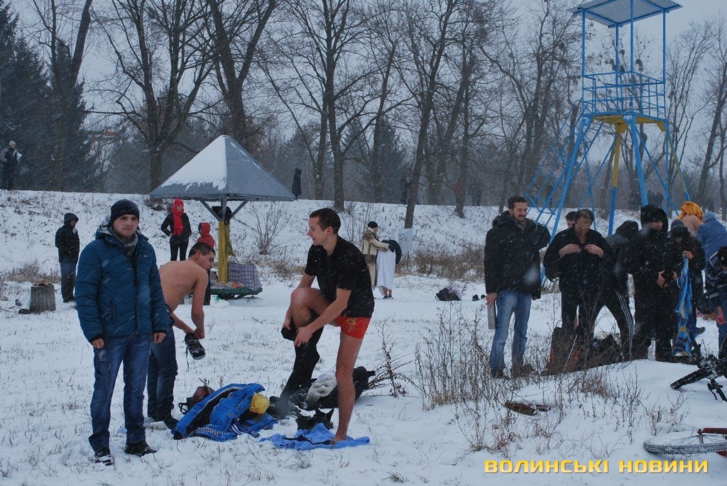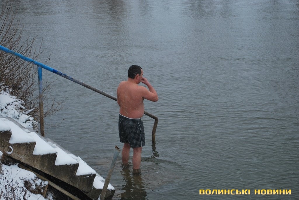 На пляжі парку священики прочитали молитву, після чого митрополит Луцький і Волинський Михаїл освятив воду Стиря.Тричі поспіль вистрілив з гармати отаман Козацького стрілецького братства Віктор Федосюк, і люди почали спускатися у холодну воду Стиря.Тим часом, берегом бігали люди з голим торсом, готуючись до занурення. Хтось грівся чаєм, а хтось – напоями більш міцними.Хоча, зі слів Валерія Макарука, який вже більше 10-ти років поспіль купається на Водохреще та близько 5-ти практикує так зване «моржування», алкоголь у цій справі – далеко не панацея.Чоловік розповідає, що у такому купанні немає нічого страшного, головне – перебороти себе і відважитись на такий вчинок: