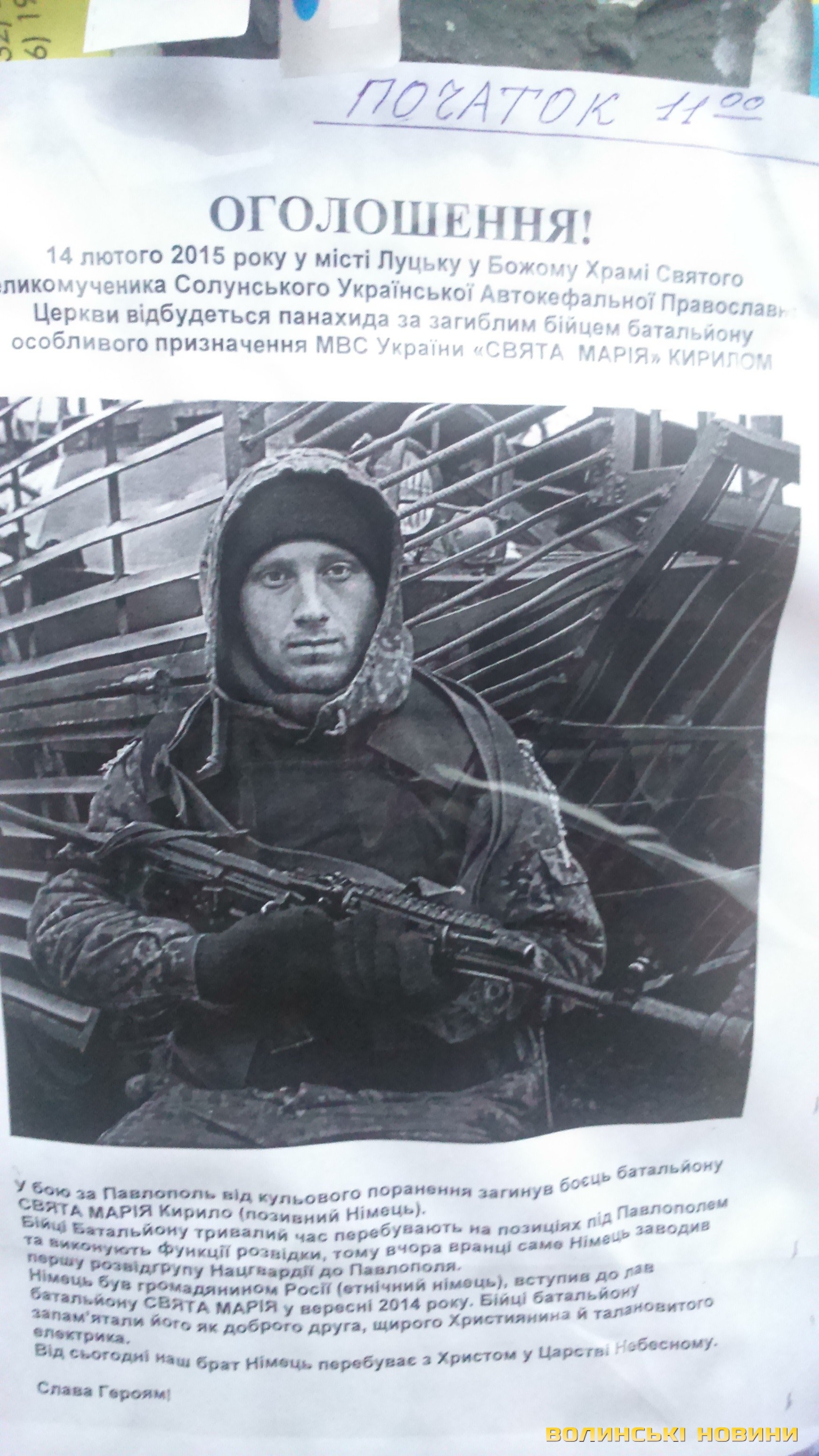 У неділю, 15 лютого, об 11 годині в Луцьку в храмі Святого великомученика Солунського української автокефальної православної церкви відбудеться панахида за загиблим Героєм.