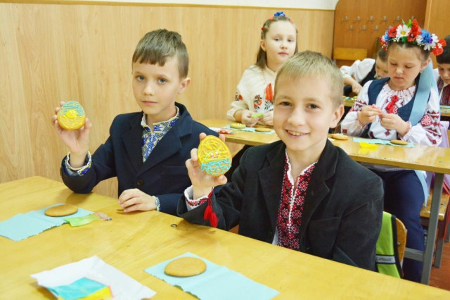Там же відбувся майстер-клас для учнів початкових класів із розпису святкового печива. Кожен з дітей власноруч розмальовував по два святкові пряники: одним смакуватимуть самі або з родиною, а інший перадали військовослужбовцям у зоні бойових дій.