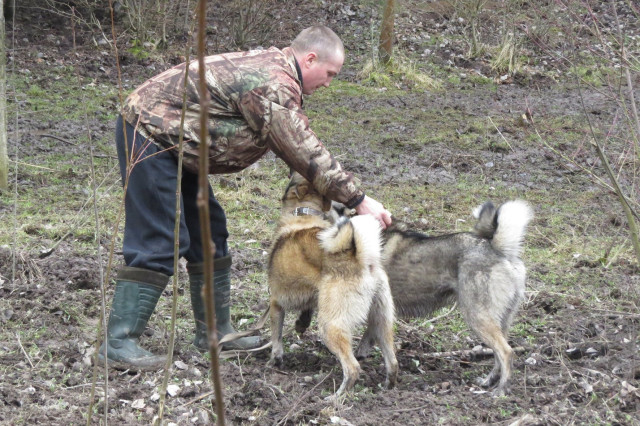 – Уже 10 років утримую вольєр поблизу села Усичі Луцького району, – розповідає Віктор Дрокін, головний кінолог Волинського осередку Федерації мисливського собаківництва України. Їздили з ним «травити» на кабана досвідченого Путіка й молодого Шороха. – Усе на власному ентузіазмі: корм для свиней привожу, ліс розчищаю, борсуків завіз. Таких вольєрів у західних областях усього три. Проводимо тут тренування, змагання. Лайок починають притравлювати з восьми місяців. До двох-трьох років собака набуває оптимальної форми. Вольєр дає загальні навики. Та у кожній справі має бути фінал. Для лайки це – здобути кабана, лося чи оленя на полюванні. Щоб пес бачив результат своєї роботи. Є невеликі вольєри, які влаштовують для бізнесу: огороджують територію 20 на 20 метрів і там травлять собак. Але часто вольєрні собаки не хочуть на полюванні працювати.