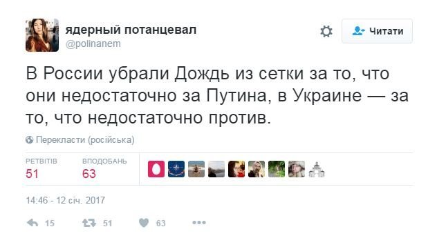Посилаючись до логотипу телеканалу, потролила "Дождь" Кримом журналістка 1+1 Аліна Денисенко.Журналіст Денис Каркача знає, як російському телеканалу уникати делікатної теми приналежності Криму.Сам телеканал відреагував на власну заборону теж доволі іронічно - запостив відео з рекомендацією дивитися "Дождь" від самого Петра Порошенка.Один із продюсерів "Дождя" вже попрощався з українською аудиторією і назвав рішення про заборону каналу "дурістю".Відреагувала і російська офіційна особа - директор департаменту інформації та друку МЗС РФ Марія Захарова зібралася писати скаргу в ОБСЄ.У Твіттері згадали, що в самій Росії "Дождю" теж не солодко. Можливо Захарова в ОБСЄ напише ще декілька рядків рядків?А в українському сегменті мережі жартують, що "Інтер" і "Вєсті" на черзі.Блогер Клим Братковський розбирається в тому, де ж вороги і чи є різниця між "Інтером" і "Дождем".У той час, як інший блогер Антон Ходзьо жартує про те, що "Дождь" ніхто і не дивився.Розгорнута версія аналізу того, чому в умовах гібридної війни небезпечно дивитися "ворожі" телеканали: