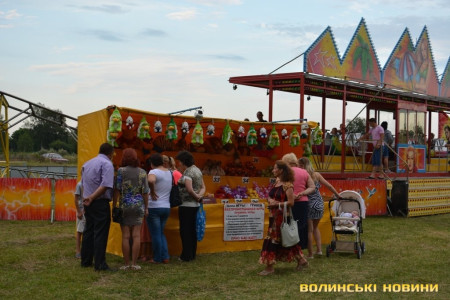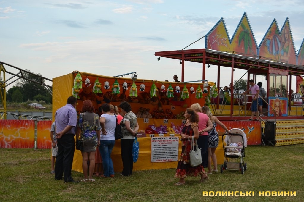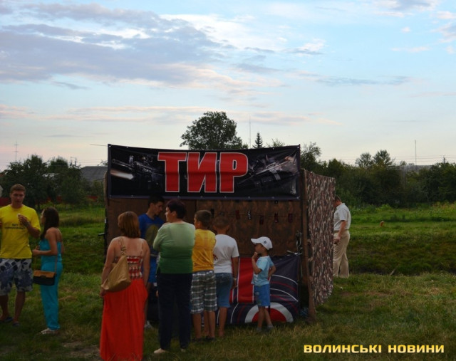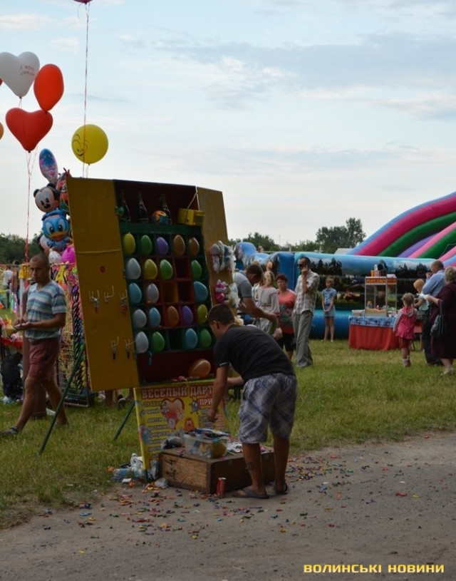 Підлітки та дорослі спробували виграти пляшку шампанського. Для цього необхідно було влучити у повітряні кульки дротиками. Або ж, заплативши двадцять гривень, протриматися на турніку дві хвилини. Приз для місцевого «стронгмена» – удесятеро більший.