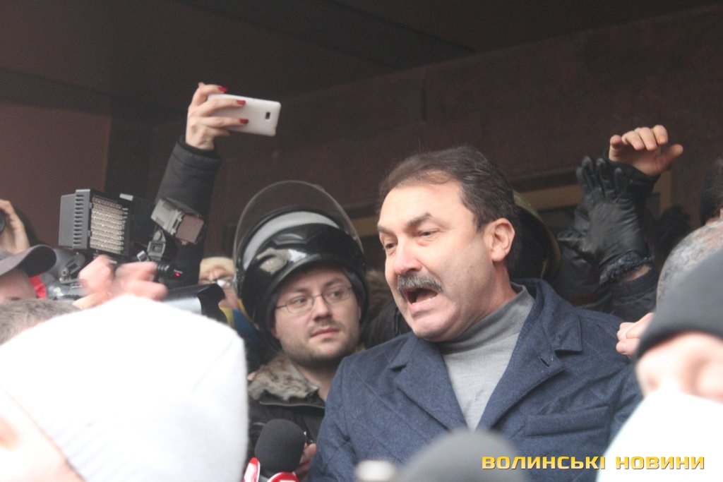 Як повідомляло Інформаційне агентство Волинські Новини, очільника ОДА привели на Театральну площу і прикували кайданами на сцені Майдану, вимагаючи написати заяву на звільнення з посади. Після того, як він категорично відмовився писаит заяву, його повезли у напрямку ОДА. Як оголосив зі сцени лідер волинського "Правого сектора", під вартою очільника Волині будуть утримувати в одному з підвальних приміщень ОДА доти, доки той не напише заяву на звільнення.