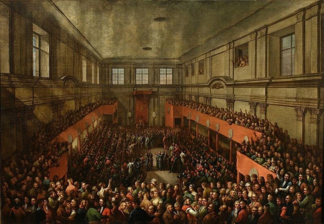 Опозиційне антиросійське (король виступав за союз з Російською імперією) крило депутатів стало звинувачувати короля в тому, що він знає про якісь наміри з боку сусідньої країни, але приховує це. Якимось дивним чином про це стали говорити всі, а на сході будь-яку зачіпку трактувати як підготовку до бунту. Зрештою чутки переросли в сеймові дебати, де їх стали обговорювати як реальну загрозу. Проте достовірних даних ніхто не мав.Засідання сейму наприквнці XVIII століття, коли приймали конституцію. Картина Казимира Войняковського з Вікіпедії
