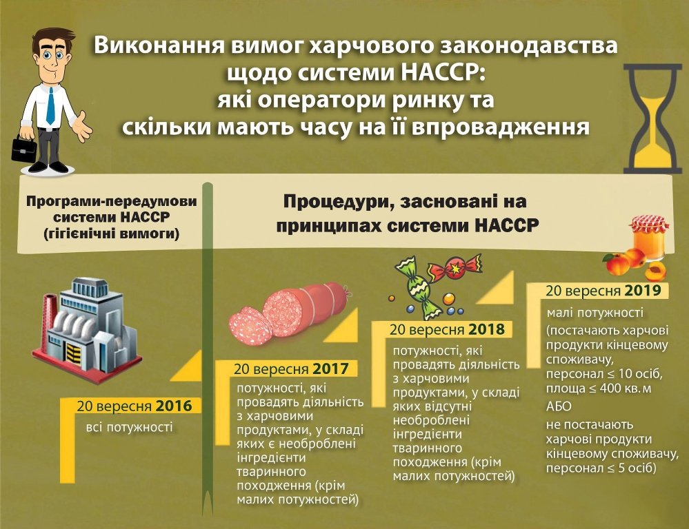 При цім упровадження принципів відбуватиметься поступово і стосується всіх операторів ринку, крім тих, хто займається первинним виробництвом. Найпізніше до 2019 року норми набудуть чинності для всіх підприємств. Більше того, для малих операторів ринку є спрощені умови щодо системи. Наприклад, вимагають не повного запровадження системи, а лише процедур, заснованих на принципах НАССР.