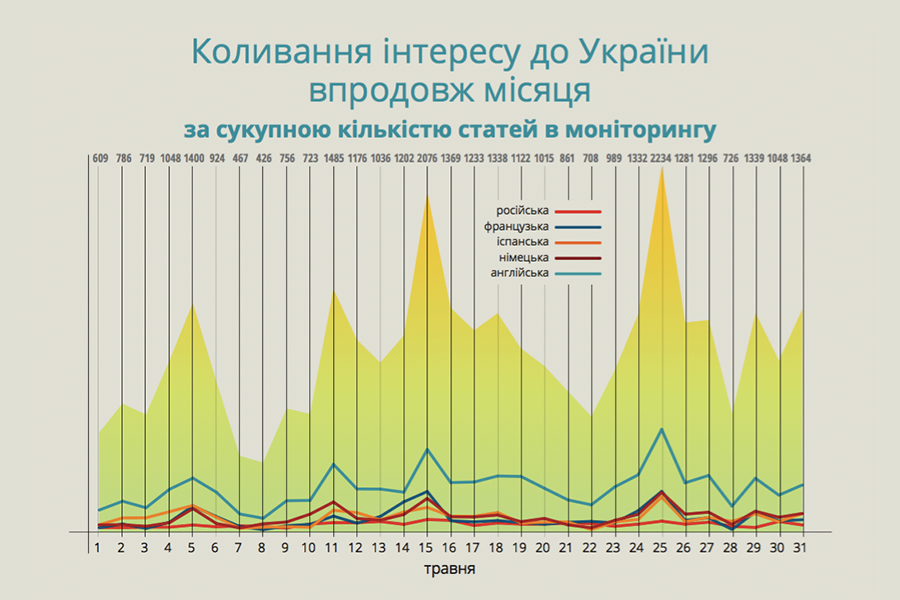 Загальна кількість статей про Україну у порівнянні з попереднім місяцем не змінилася. Однак при цьому змінилася кількість позитивних інформаційних приводів щодо України. Принаймні два з них створили небачену до цього хвилю схвальних та інтонаційно піднесених публікацій.