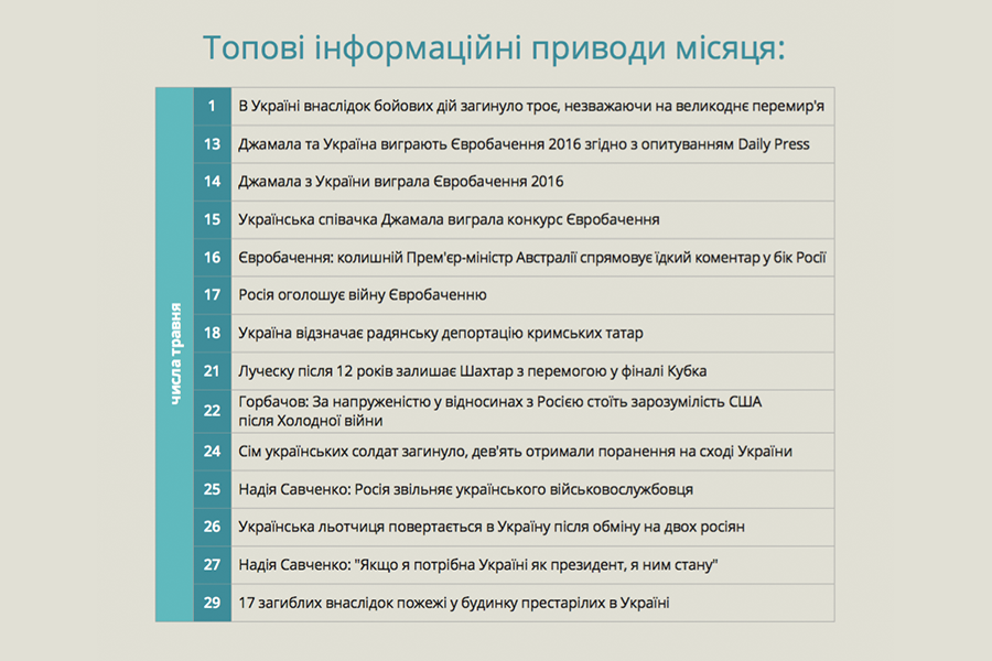 З 13 по 17 травня темою дня була перемога Джамали: від перших опитувань до переказу подій конкурсу та політичних обговорень довкола змісту пісні і геополітичної ситуації. Найпопулярнішим став матеріал CNN за 15 травня «Українська співачка Джамала виграла конкурс Євробачення» (понад 40 тис. лайків, поширень і коментарів у Facebook і Twitter).