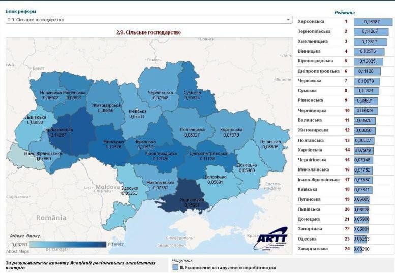 Згідно з результатами проекту асоціації регіональних аналітичних центрів, Волинь займає 11 сходинку серед 24 областей України у напрямку економічного та галузевого співробітництва у сфері сільського господарства.