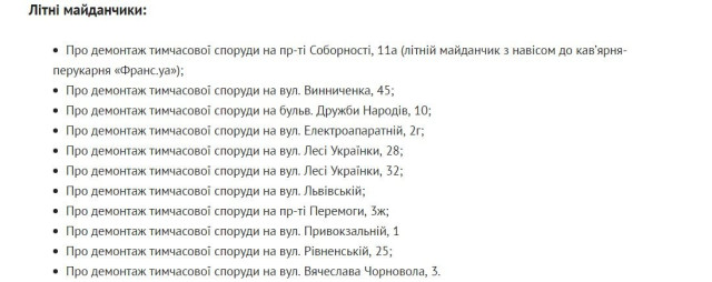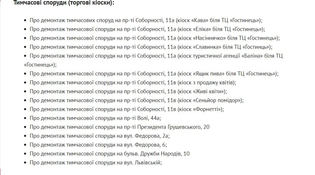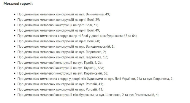 Зокрема, на черговому засіданні виконавчим комітетом Луцької міської ради були прийняті рішення про демонтаж тимчасових споруд на території міста, що розташовані без правовстановлюючих та дозвільних документів.