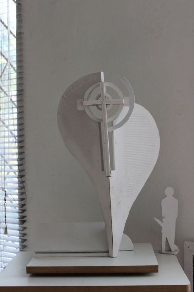 Разом із тим опальний скульптор похизувався своїм макетом монумента пам’яті Небесної сотні, який і запропонував на конкурс. Зі слів автора, на скульптурі він зобразив серце, прострілене кулею снайпера із прицілом, що переходить у хрест. Чорно-біле забарвлення пам’ятника означає одвічну боротьбу добра і зла. Також цей твір своєю формою повинен нагадати волинянам про перо історії.