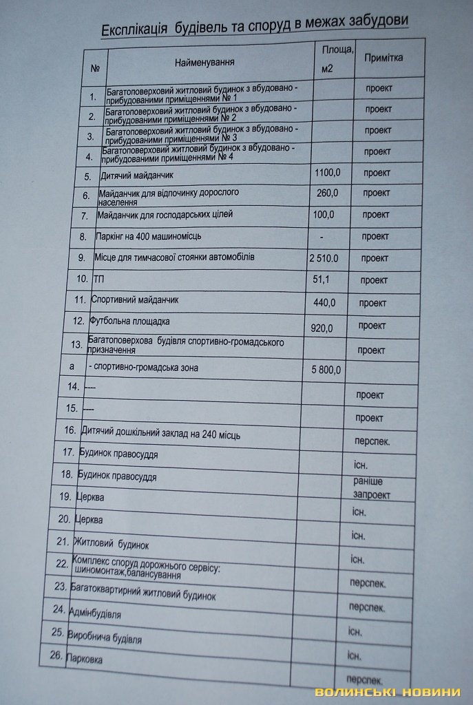 Пропонований список будівель та споруд у новому кварталі.