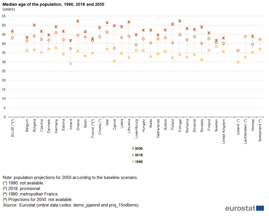 Прогнозується, що середній вік ЄС упродовж наступних трьох десятиліть збільшиться на 3,8 року, і буде становити 46,9 років до 2050 року. Ця закономірність буде повторюватися в кожній з країн-членів ЄС, водночас середній вік населення, як прогнозується, зросте на 8 років або більше на Кіпрі, Мальті, в Польщі та Словаччині.