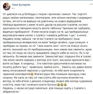 І все знаєте чого?Ніхто не планує нічого міняти, економія на з/п прибиральницям, яких немає ким замінити, адже на таку з/п люди не хочуть працювати і ведуть себе як хочуть, бо їх не звільнять, бо немає ким замінити", - висловила своє невдоволення Таня Бутерлін.