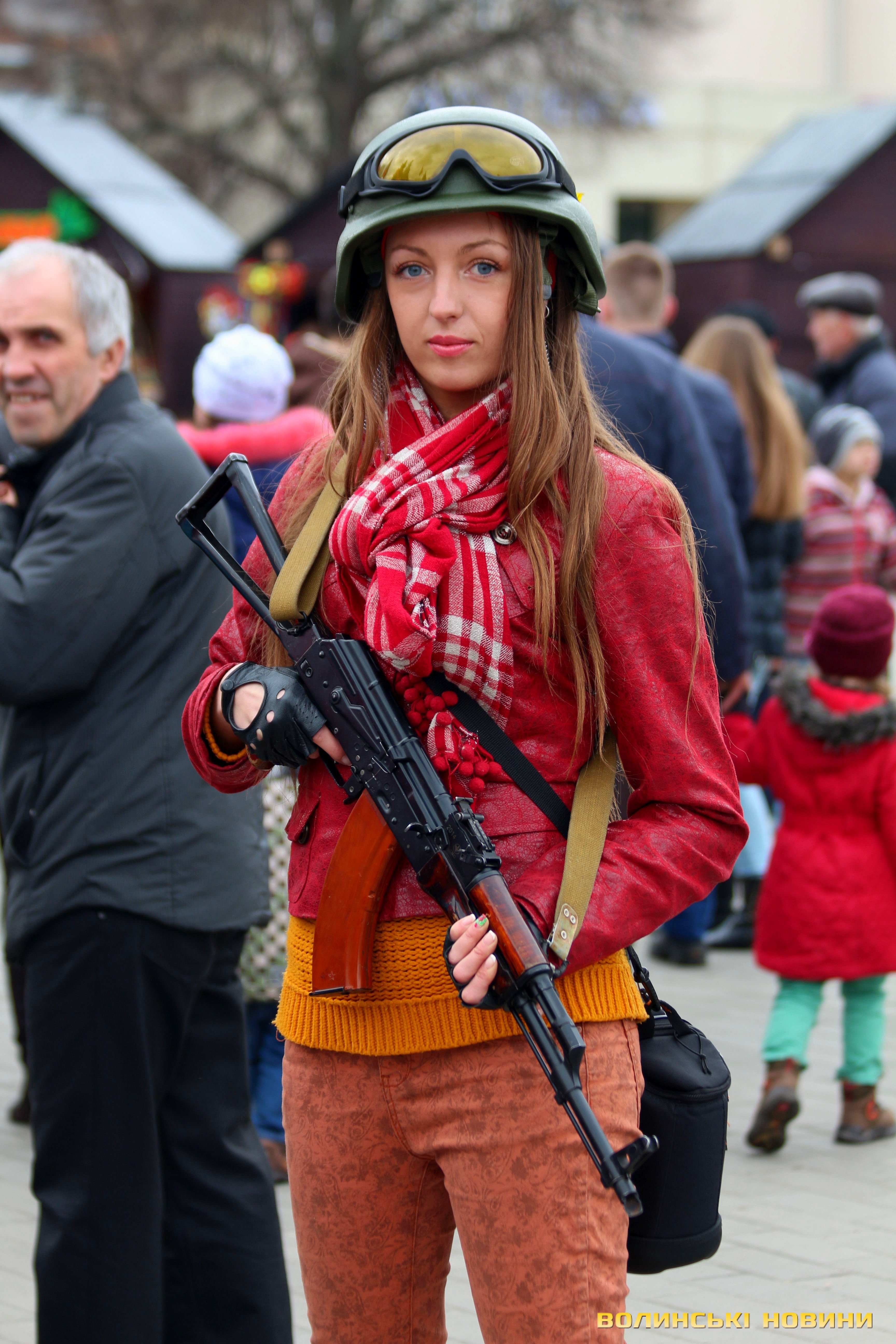 А що це за пані в червоному з калашом?