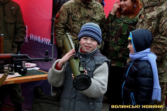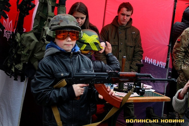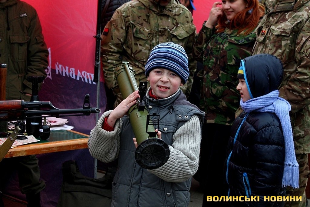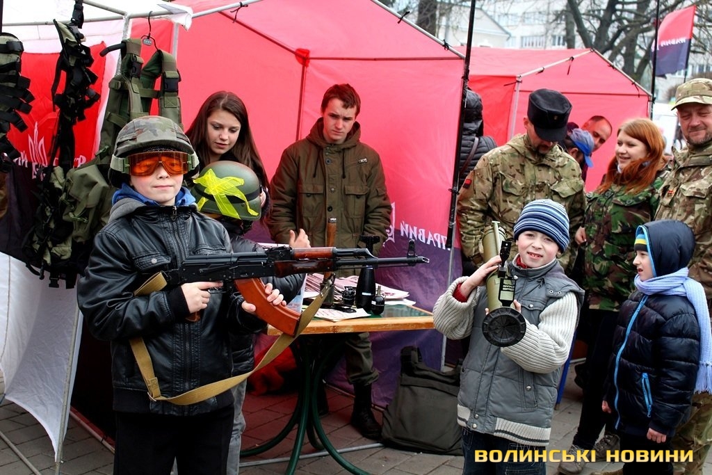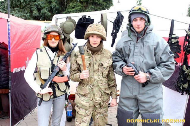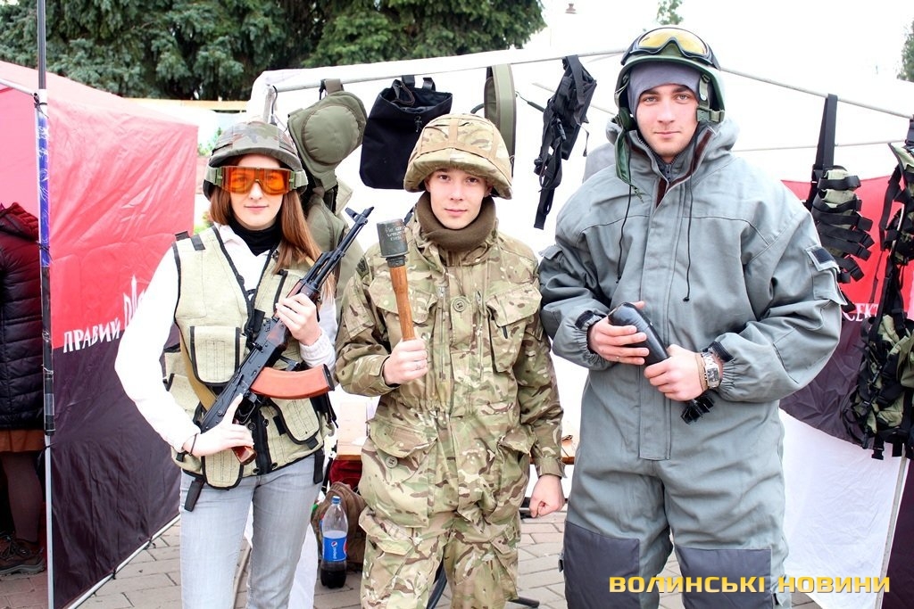 Окрім цього, під час благодійного ярмарку продавали вироби з українською символікою та демонстрували військове озброєння. Як малюки, так і дорослі мали змогу приміряти на себе військову амуніцію, зібрати та розібрати автомат, потримати у руках «муху», а також повправлятися у військовому мистецтві.Досвідчені медовари пропонували скуштувати смачні питні меди, а у передтиждень Великодня лучани з задоволенням купували пишні святкові хлібці-паски та розмальовували писанки.До слова, фіксованої ціни на смаколики активісти не ставили, мовляв, «кидайте у скриньку, скільки не шкода».Також організували патріотичний боді-арт.А, розмалювавшись, лучани могли сфотографуватись на фоні колоритної української хатинки, або зі зброєю в руках.І, навіть незважаючи на примхливу квітневу погоду, сміх, радощі та хороший настрій не покидали центральний майдан обласного центру.