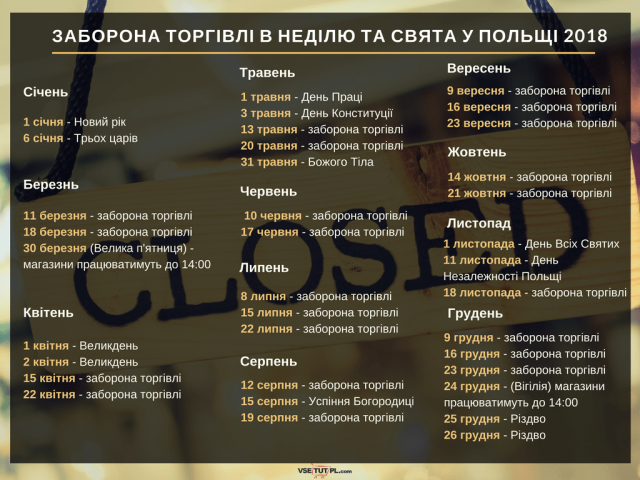 Перелік днів у 2018 році, коли торгівля в Польщі НЕ відбуватиметься: