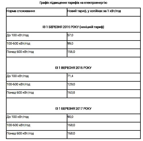 У НКРЕКУ додали, що загалом у місяць витрати споживачів на електрику зростуть на 7,2 гривні при споживанні 50 кВт/год, на 14,4 гривень – при споживанні 100 кВт/год та на 29,4 копійок при споживанні 150 кВт/год.А вже з 1 березня 2017-го має відбутися останнє із запланованих зростань цін: за 1 кВт/год доведеться платити 0,90 гривні (у разі споживання до 100 кВт/год) та 1,68 гривні (у разі споживання понад 100 кВт/год).