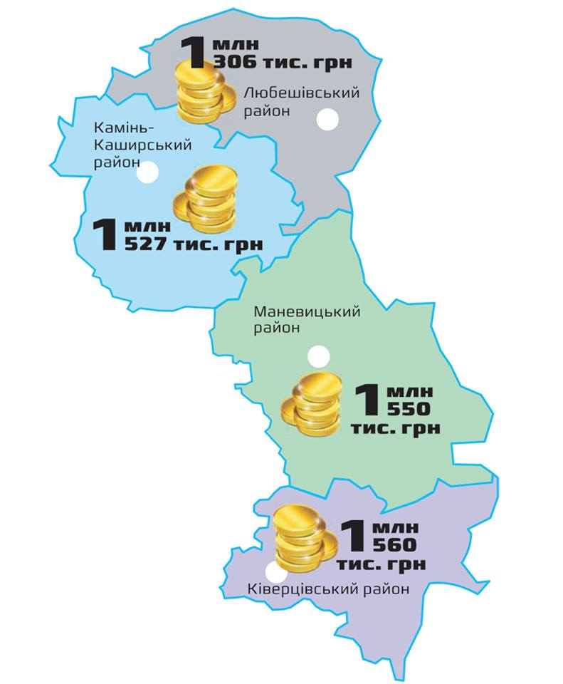 Зокрема, для Камінь-Каширського району виділено 1 млн 527 тис. грн, Ківерцівського – 1 млн 560 тис. грн, Маневицького – 1 млн 550 тис. грн, Любешівського – 1 млн 306 тис. грн.