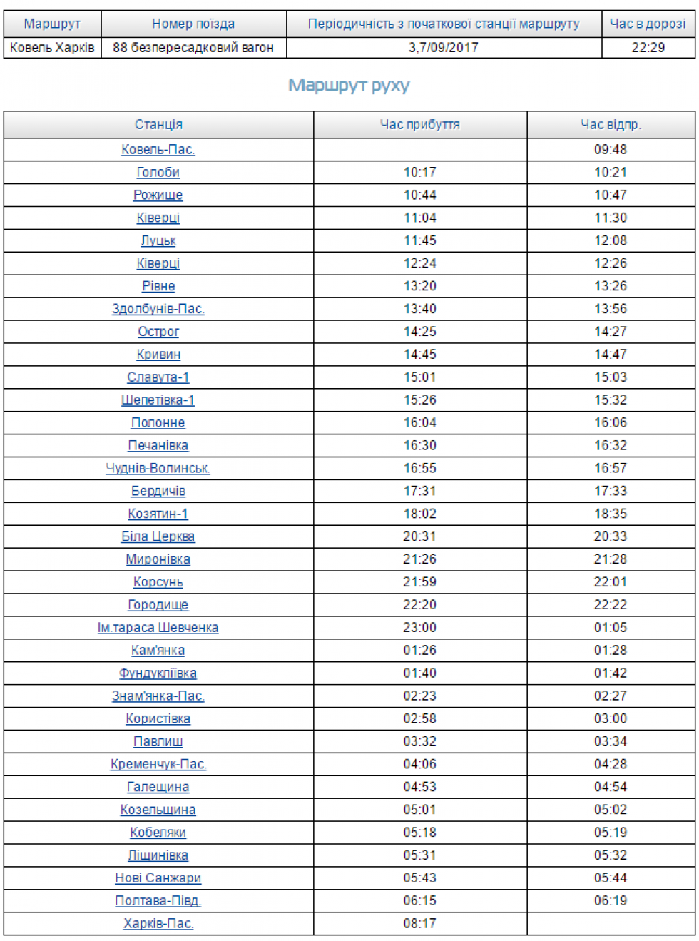 Як зазначається в розкладі, поїзд відправлятиметься з Ковеля о 9:48 ранку (з Голоб о 10:21) і прибуватиме наступного дня 0 8:17 ранку в Харків.