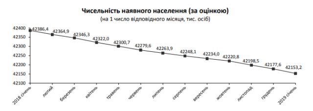 Згідно з даними, залишається суттєвим перевищення кількості померлих над кількістю живонароджених: на 100 померлих – 57 живонароджених. Лише з грудня 2018 року по січень 2019 населення України скоротилося на понад 20 тисяч осіб.