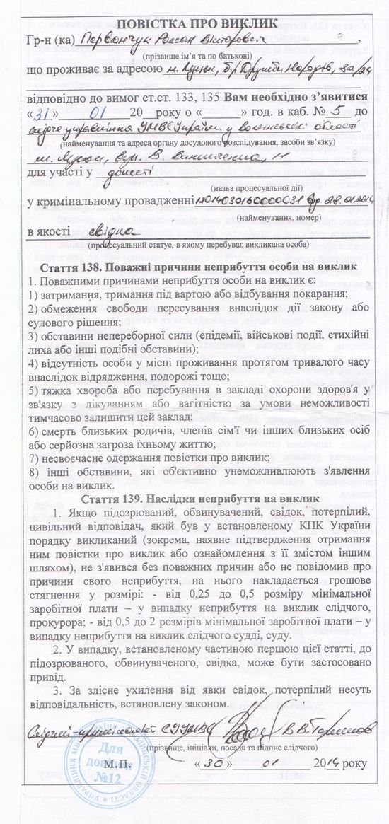 Цього разу мітингувальників запрошують у якості свідків у справі про заяву депутата від Партії регіонів, щодо погроз життю та здоров’ю. Виявляється, одна з депутатів Волиньради, яка представляє Маневицький район, звернулася до прокуратури з заявою, щодо погроз, які нібито були висловлені невідомими особами до її матері.