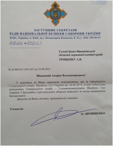 "У відповідь на Ваше звернення повідомляємо, що за інформацією Генерального штабу Збройних Сил України від 28.08.2014, згідно з рішенням начальника Генерального штабу – Головнокомандувача Збройних Сил України 5 батальйон територіальної оборони виведено до місця відновлення боєздатності", - йдеться у листі.