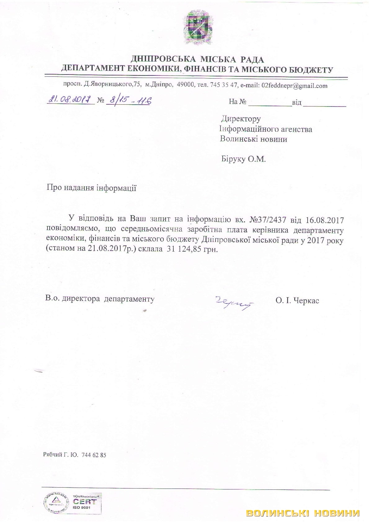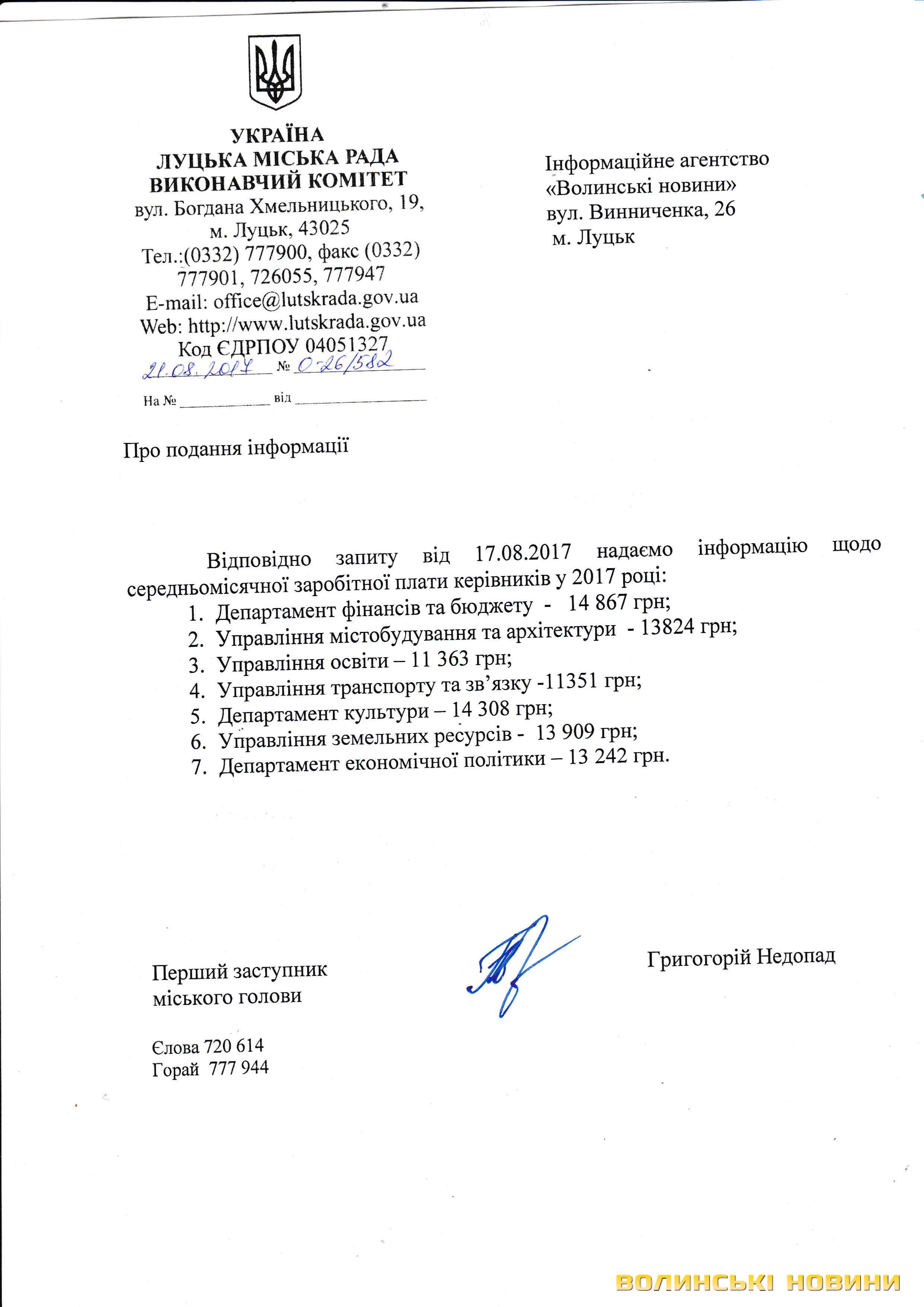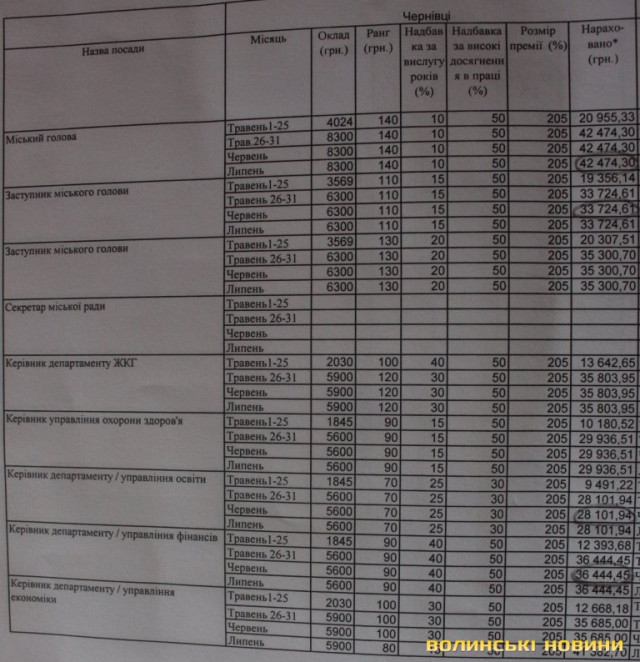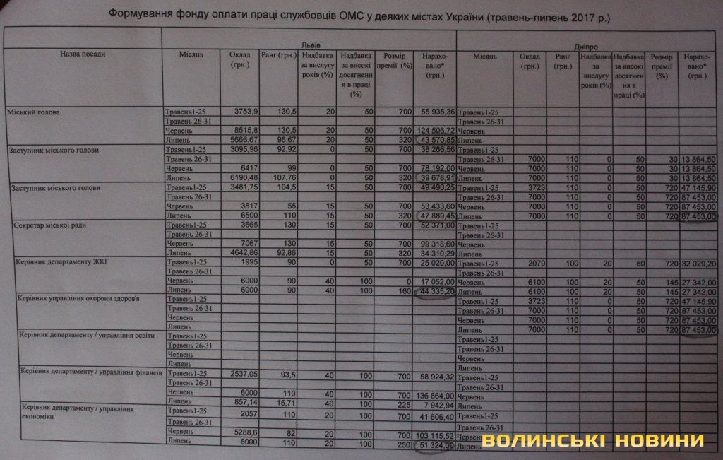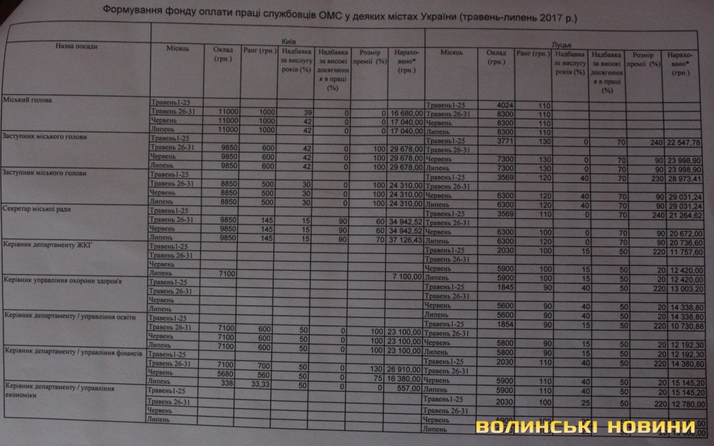 Інформаційне агентство Волинські Новини порівняло заробітні плати, за середньомісячними показниками, заступників міських голів і керівників окремих управлінь, підпорядкованих міським радам, у таких містах, як Київ, Вінниця, Чернігів, Львів, Чернівці, Дніпро та, звичайно, Луцьк.