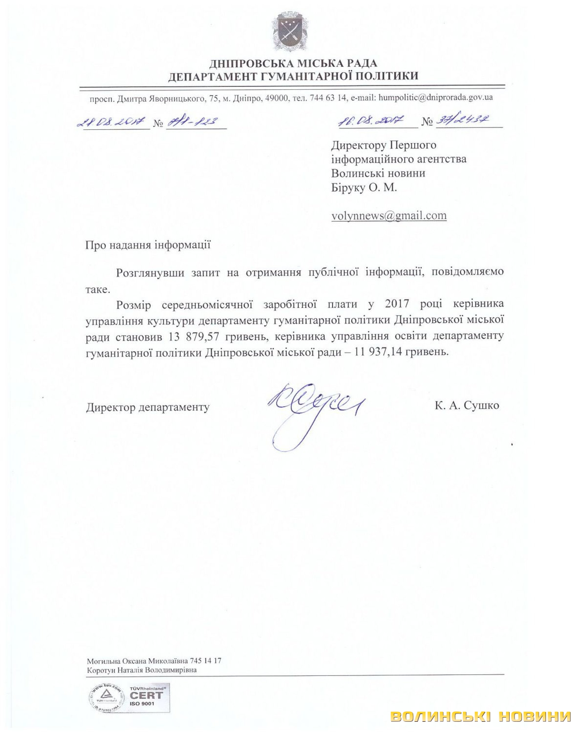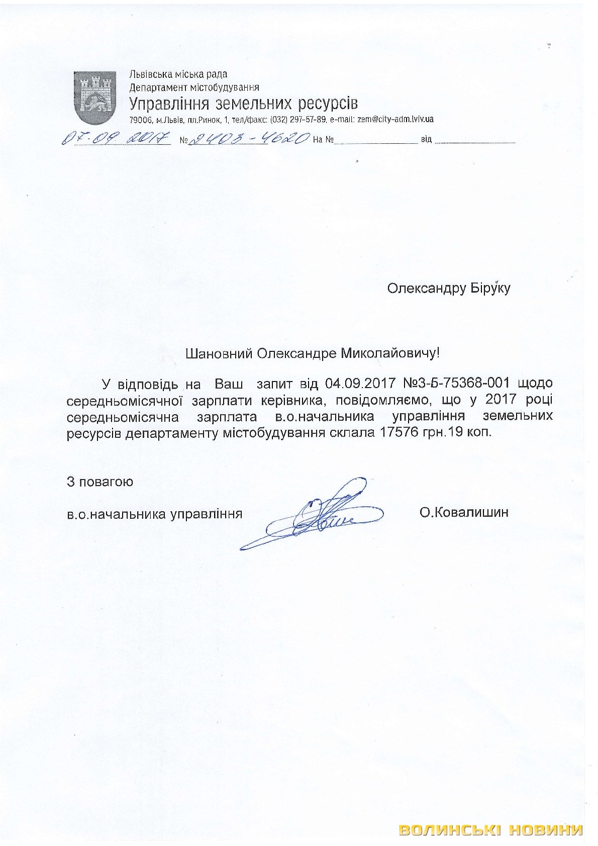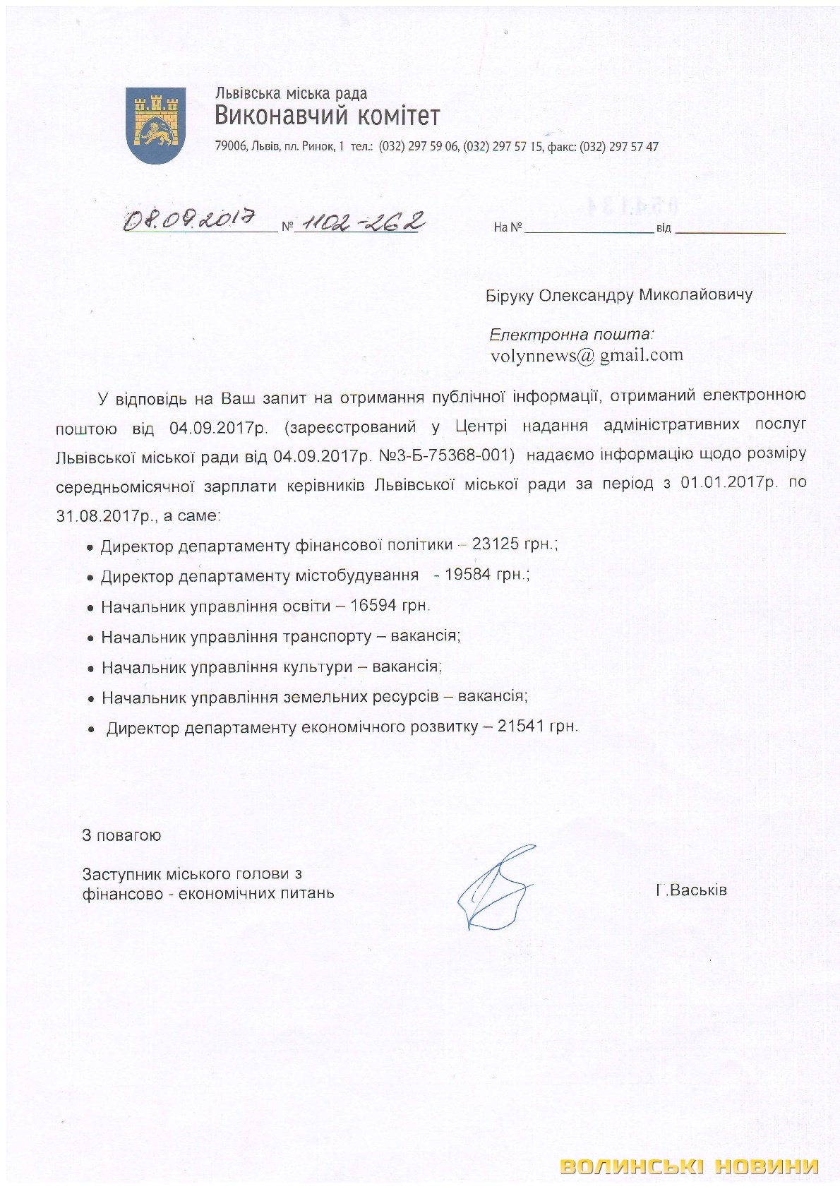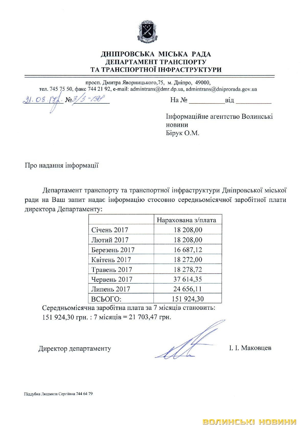 Окрім того, керівник департаменту благоустрою та інфраструктури міськради Дніпра заробляє 32 228,56 грн на місяць, керівник департаменту економіки, фінансів та міського бюджету – 31 124,85 грн, управління житлово-комунального господарства – 28 904,33, а керівник департаменту транспорту та транспортної інфраструктури – 21 703,47 грн.Не надто відстають від дніпровських держслужбовців і управлінці Львівської міської ради, керівник управління фінансів якої в місяць одержує 67 910,42 грн. Трішки менше мають керівники управління економіки та управління ЖКГ – 65 348,64 та 28 802,4 грн відповідно. (Дані за травень-липень 2017 року).
