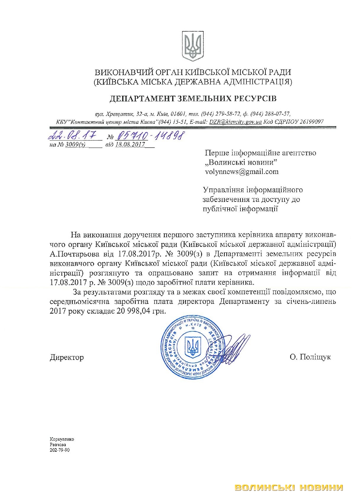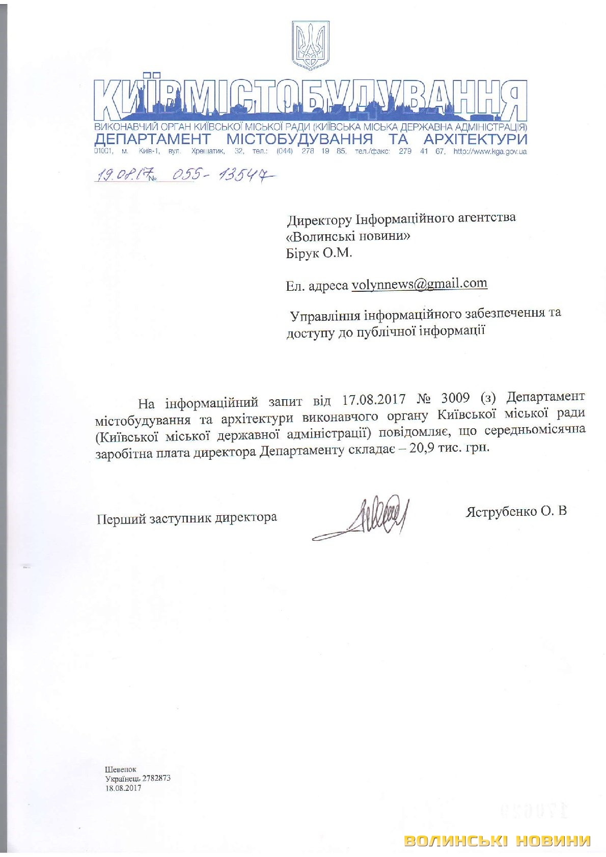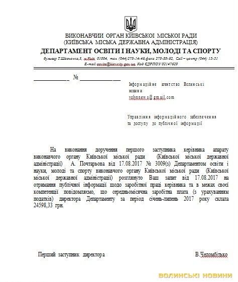 У кілька разів менші суми за зарплатні своїх колег отримують керівники департаменту фінансової політики – 23 125 гривень, департаменту економічного розвитку – 21 541 гривню, департаменту містобудування – 19 584 гривні, управління освіти – 16 594 гривні, а також виконувачі обов’язків керівників управління земельних ресурсів департаменту містобудування – 17 576,19 грн й управління транспорту департаменту житлового господарства та інфраструктури – 16 743 грн. (Дані за січень-серпень 2017 року).Середньомісячні зарплати чиновників Чернігова коливаються навколо показника у 28 тисяч гривень. Згідно зі статистичними даними за травень-липень 2017 року, керівник департаменту житлово-комунального господарства Чернігівської міської ради заробляє 30 588,85 грн, керівник управління охорони здоров’я – 29 425,3 грн, управління освіти – 29 563,43 грн, управління фінансів – 26 942,92 грн та управління економіки – 26 942,92 грн.Як не дивно, у Києві міськрадівці заробляють не найбільше серед своїх колег із інших регіонів. Так, керівник департаменту фінансів Київської міської ради має в місяць 26 952,32 грн (середні дані за 2016 рік), керівник департаменту освіти і науки, молоді та спорту – 24 598,33 грн, департаменту культури – 22 625,9 грн, департаменту земельних ресурсів – 20 998,04 грн, департаменту містобудування та архітектури – 20 900 гривень і транспортної інфраструктури – 18 250 гривень (дані за січень-липень 2017 року).Порівняно «скромні» зарплати одержують управлінці Вінницької міської ради, де керівник департаменту ЖКГ має в місяць 18 931,56 грн, а керівники управлінь охорони здоров’я та економіки – по 13 768,5 грн (дані за травень-липень 2017 року).