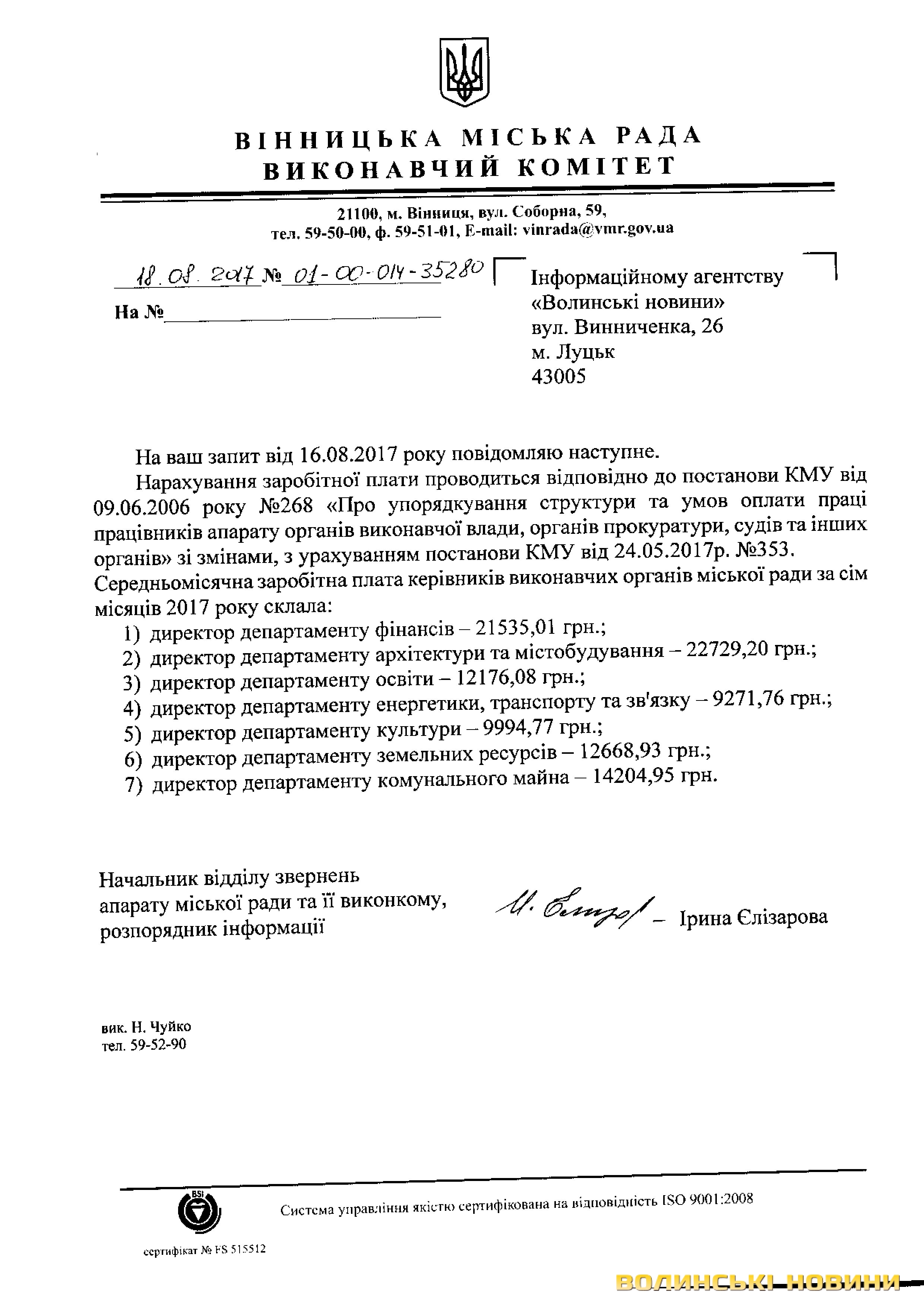 Керівник департаменту архітектури та містобудування міськради Вінниці, своєю чергою, заробляє 22 729,2 грн, департаменту фінансів – 21 535 гривень, департаменту комунального майна – 14 204,95 грн, департаменту земельних ресурсів – 12 668,93 грн, департаменту освіти – 12 176,08 грн, департаменту культури – 9 994,77 грн, а департаменту енергетики, транспорту та зв’язку – 9 271,76 грн (дані за січень-липень 2017 року).Пасуть задніх за рівнем заробітків очільники департаментів Луцької міської ради, зарплати яких не перевищують показника в 14 тисяч гривень. Наприклад, відповідно до даних за травень-липень 2017 року, керівник департаменту житлово-комунального господарства щомісяця отримує 12 199,2 гривень, а керівник управління охорони здоров’я – 13 893,6 гривні.