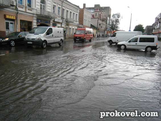 Фактично за кілька хвилин Ковель накрила темна хмара, і вулиці міста потонули в дощовій воді. Зливова каналізація не встигала «приймати» великі потоки води, тому пішохідні доріжки вздовж проїжджих доріг, як зафіксувала наша фотокамера, просто зникли.