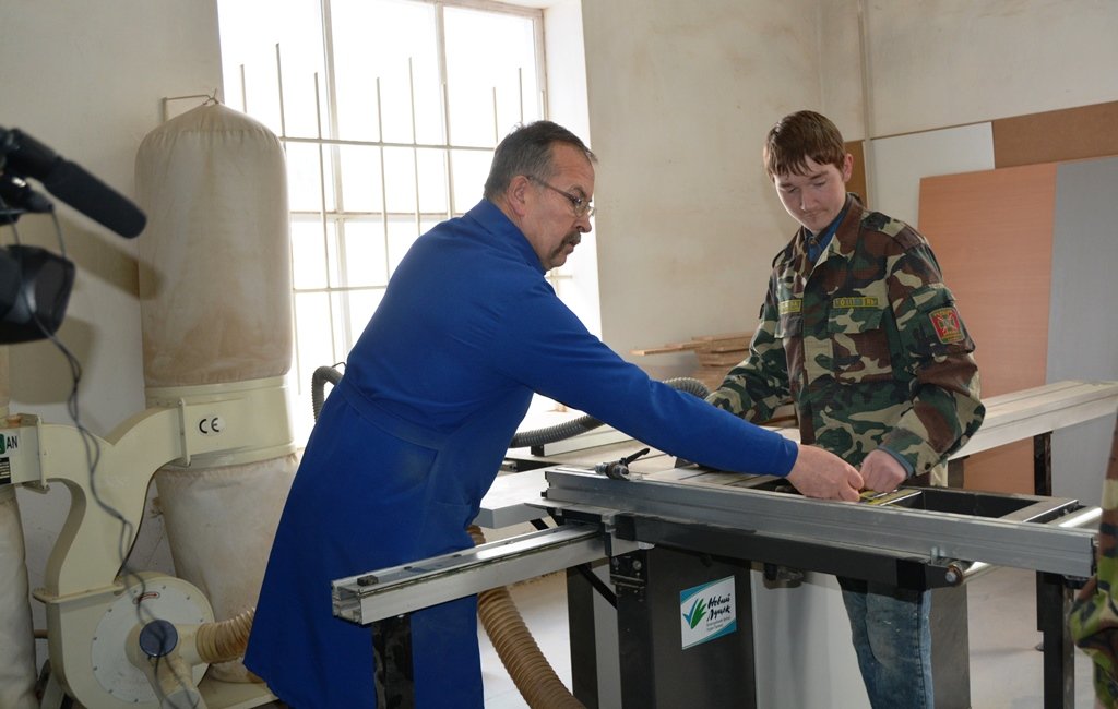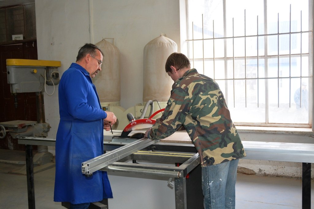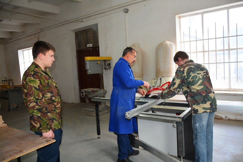 Тим часом деревообробні верстати, що їх Фонд придбав у 2015 році, теж не припадають пилом. У столярів виробниче навчання проходить під пильним оком майстра з двадцятирічним досвідом В’ячеслава Романюка. Хлопці навчаються на третьому курсі, та столярну справу вивчають перший рік. Вони вже вміють працювати з ручним інструментом, зараз опановують механічну обробку деревини. Наявність верстатів дозволила залагодити «меблеві» питання для самого училища. З допомогою нового верстата студенти виготовляють меблі для потреб навчального закладу: реставрують учнівські столи, парти.