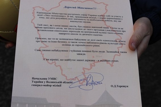 На завершення за таке небайдуже ставлення до безпеки своїх односельців Максимкові вручили пам’ятний лист-відповідь за підписом начальника УМВС України у Волинській області Олександра Терещука та подарунок.