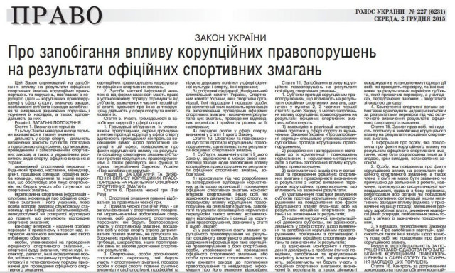 У сьогоднішньому номері газети "Голос України" був опублікований повний текст Закону України №743-VIII "Про запобігання впливу корупційних правопорушень на результати офіційних спортивних змагань".