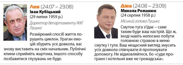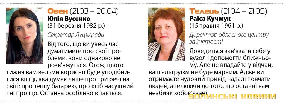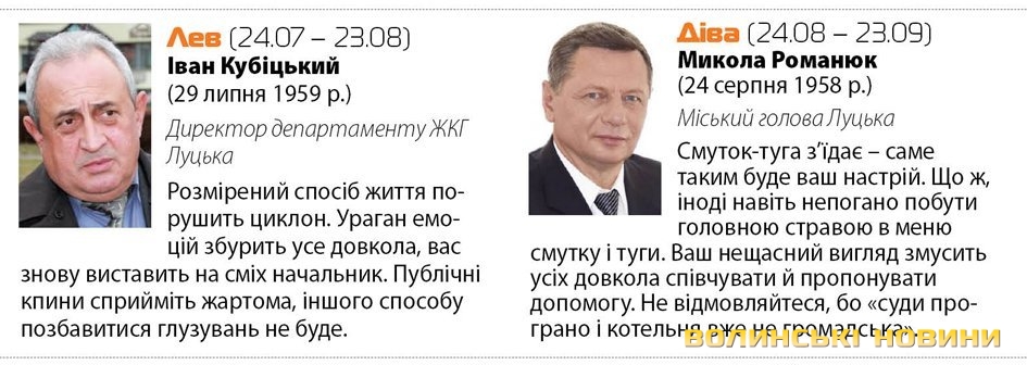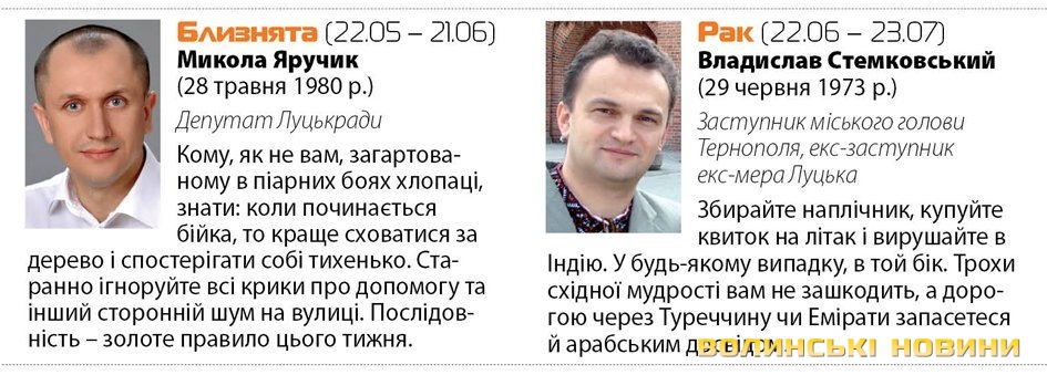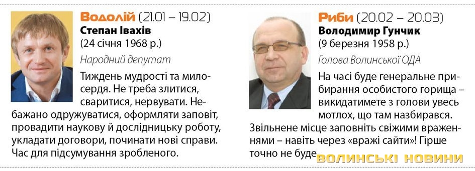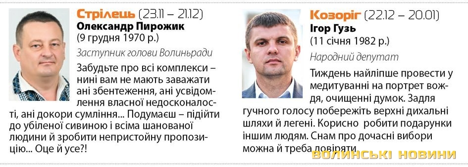 Щотижневе видання – газета «Волинські Новини» – пропонує читачам жартівливо-політичний гороскоп. Нагадаємо, 4-й номер нового обласного тижневика побачив світ 25 лютого. До слова, кожен може безплатно завантажити PDF-версію газети Волинські Новини. Свіжий номер видання в електронному варіанті можна буде отримати щопонеділка. Сам же тижневик у продажі з’являтиметься на кілька днів раніше, у четвер. Жартівливий гороскоп від газети «Волинські Новини» вам злегка прочинити завісу в майбутнє: