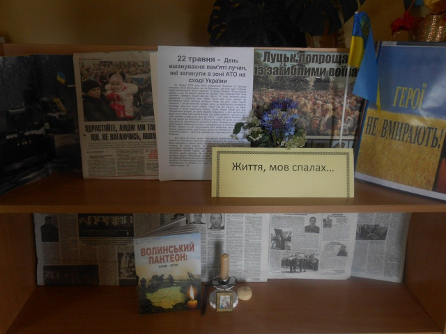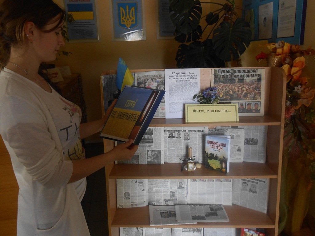 Виставка, приурочена до Днявшанування пам’яті лучан, які загинули в зоні АТО на сході України (який, нагадаємо, відзначатимуть 22 травня), триватме у центральній міській бібліотеці для дорослих( Декабристів, 25) 20-25 травня.