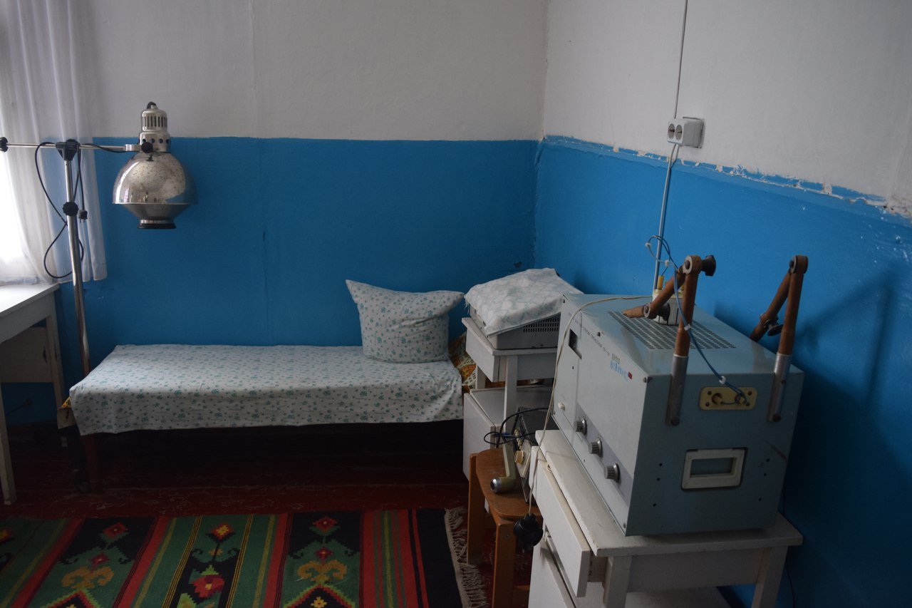 Щоб зайти в низьку цегляну будівлю, доводиться «кланятися». Нам, містянам, звиклим до високих стель, ріже око контраст білих стін із темними тріщинами. І постійно здається, що ця установа розчавить нас. Низькі кушетки, застелені біло-вилинялими простирадлами, пишні подушки та металеві, ще радянські, медичні прилади. Попри те, що лікарняний заклад дихає на ладан, його працівники намагаються створити тут затишок для пацієнтів – на вікнах тюль, на підлозі килимки.