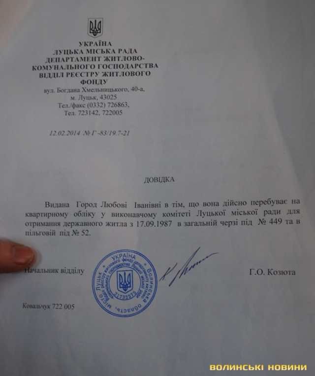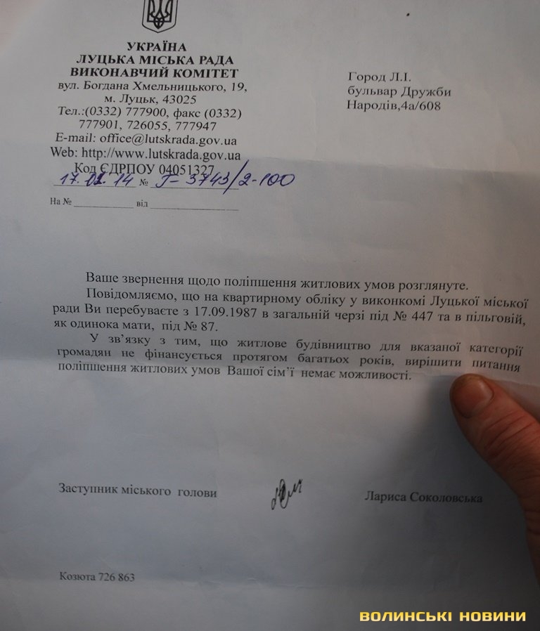 Лучанка каже, що вже зверталася неодноразово за допомогою до Луцького міського голови Миколи Романюка, але постійно відписувала листи його заступник Лариса Соколовська: «У зв’язку з тим, що житлове будівництво для вказаної категорії громадян не фінансується протягом багатьох років, вирішити питання поліпшення житлових умов Вашої сім’ї немає можливості».