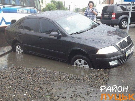Права частина автомобіля марки Шкода Октавія, який стояв на перехресті вулиць Данила Галицького-Кафедральної, частково провалилась під землю, - інформує Район.Луцьк.