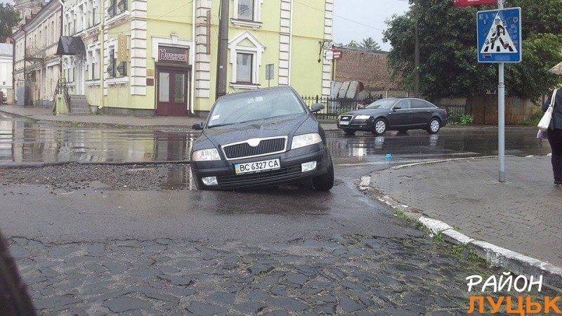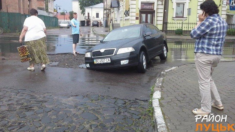 Права частина автомобіля марки Шкода Октавія, який стояв на перехресті вулиць Данила Галицького-Кафедральної, частково провалилась під землю, - інформує Район.Луцьк.