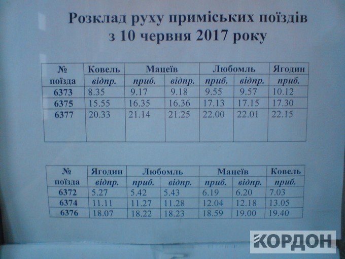 Зокрема, другий і третій рейси з Ягодина на Ковель відправляються об 11.11 та 18.07, з Любомля — відповідно об 11.28 та 18.23. Прибуття у Ковель — о 13.05 та 19.40.