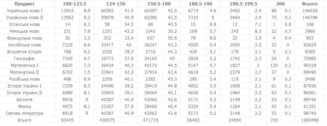Найбільша частка абітурієнтів склала тестування з результатом в проміжку 124-150 та 150-180 балів, що становить 436575 та 471719 робіт відповідно.