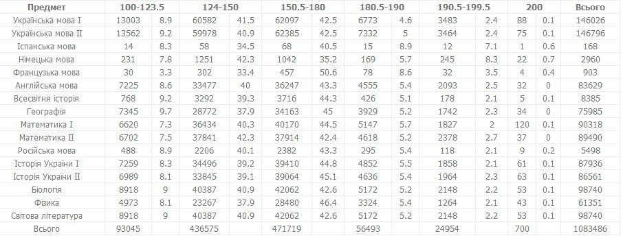 Найпопулярнішими предметами серед абітурієнтів стали: українська мова та література – 292822, математика – 179808, історія України – 174497 осіб, а найменш популярними – іспанська та французька мови, за якими склали ЗНО 168 та 903 абітурієнти відповідно, - пише InfoLight.