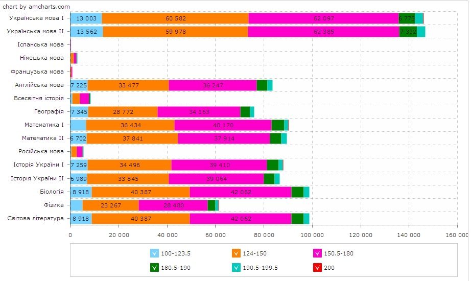 Інтерактивна діаграма з результатами, які отримали абітурієнти на основній сесії ЗНО: