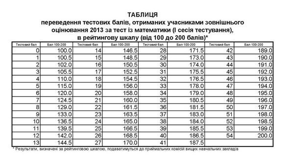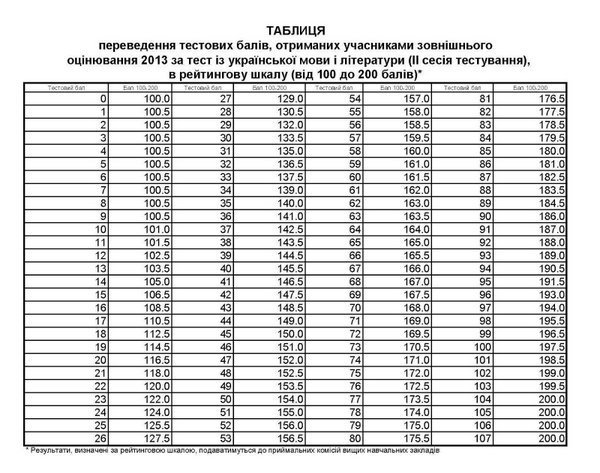 Таблиці переведення тестових балів у 200-бальну шкалу 2013 року: