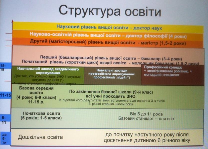 Зокрема, заступник міністра оприлюднив схему структури освіти, що має бути впроваджена в Україні після ухвалення рамкового закону про освіту. Дошкільна освіта триватиме до досягнення 6-ти річного віку, після чого дітей зараховуватимуть до шкіл. Планується, що в Україні буде впроваджено 12-річну школу, яка функціонуватиме за схемою 5+4+3.