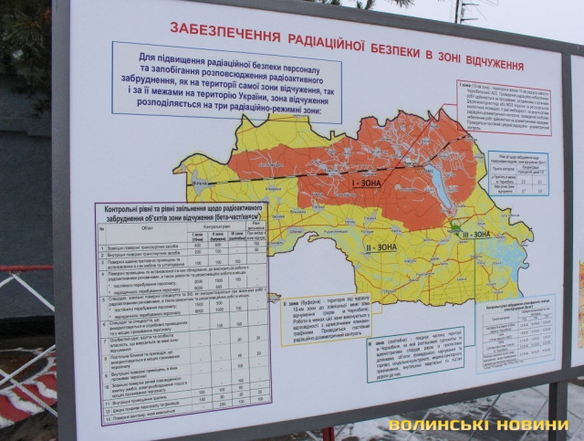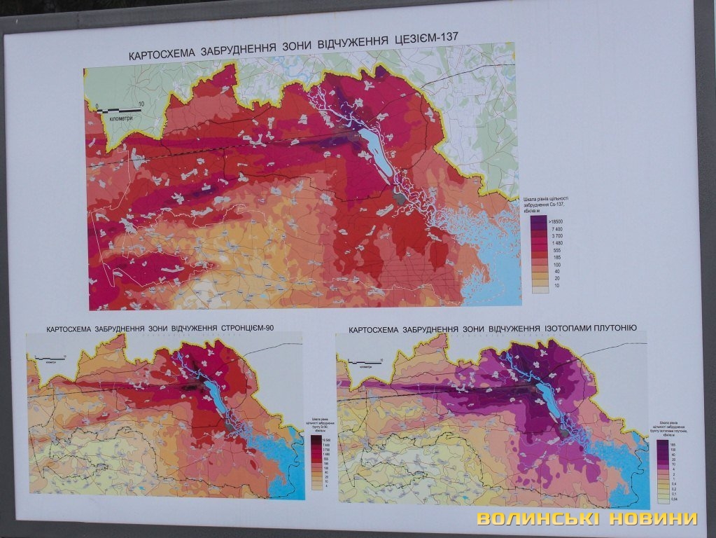 Вже на першому КПП на шляху до зони відчуження на інформаційних стендах можна побачити мапу забруднення зони ізотопами плутонію, стронцієм-90 та цезієм-137. Відвідувачам забороняють вивозити за межі зони ягоди, гриби, фрукти, овочі, домашніх тварин.