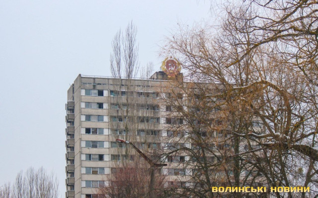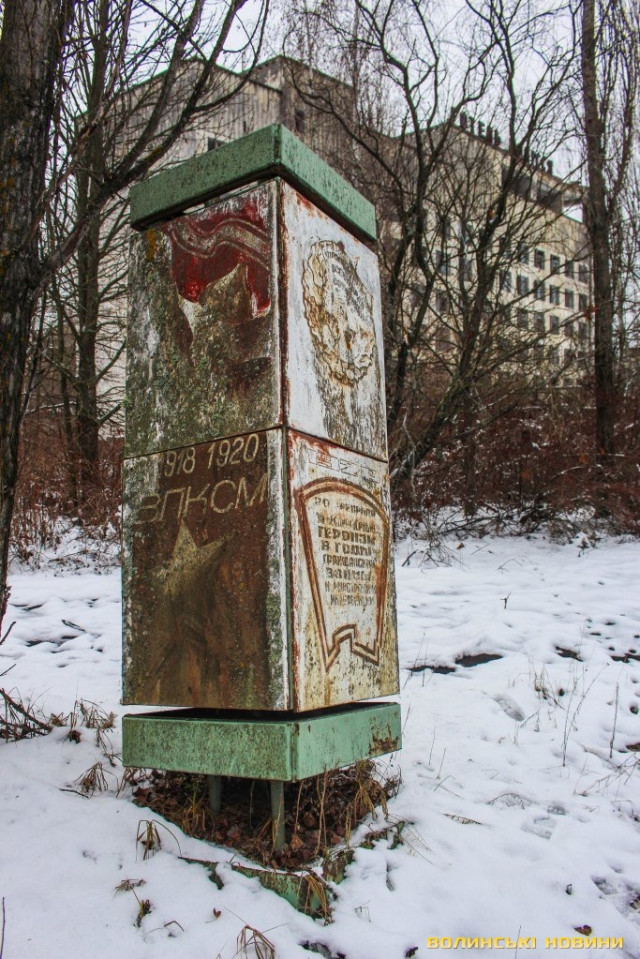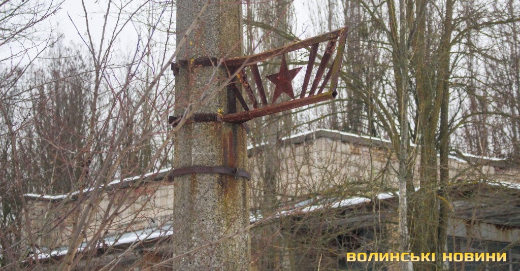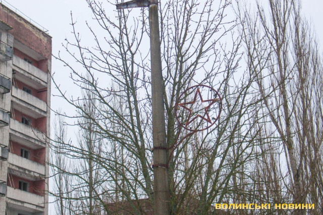 На території Прип’яті привертає увагу явище, що можна було б назвати «природньою декомунізацією». На іржу та порох перетворюються металеві п’ятикутні зірки, герби СРСР, ледь впізнаваною стає радянська символіка на вуличних стендах, вицвіло на сонці привітання з 1-им травня, намальоване на склі магазина. Поволі руйнується і моторошне нині гасло на одній з багатоповерхівок «хай буде атом робітником, а не солдатом».